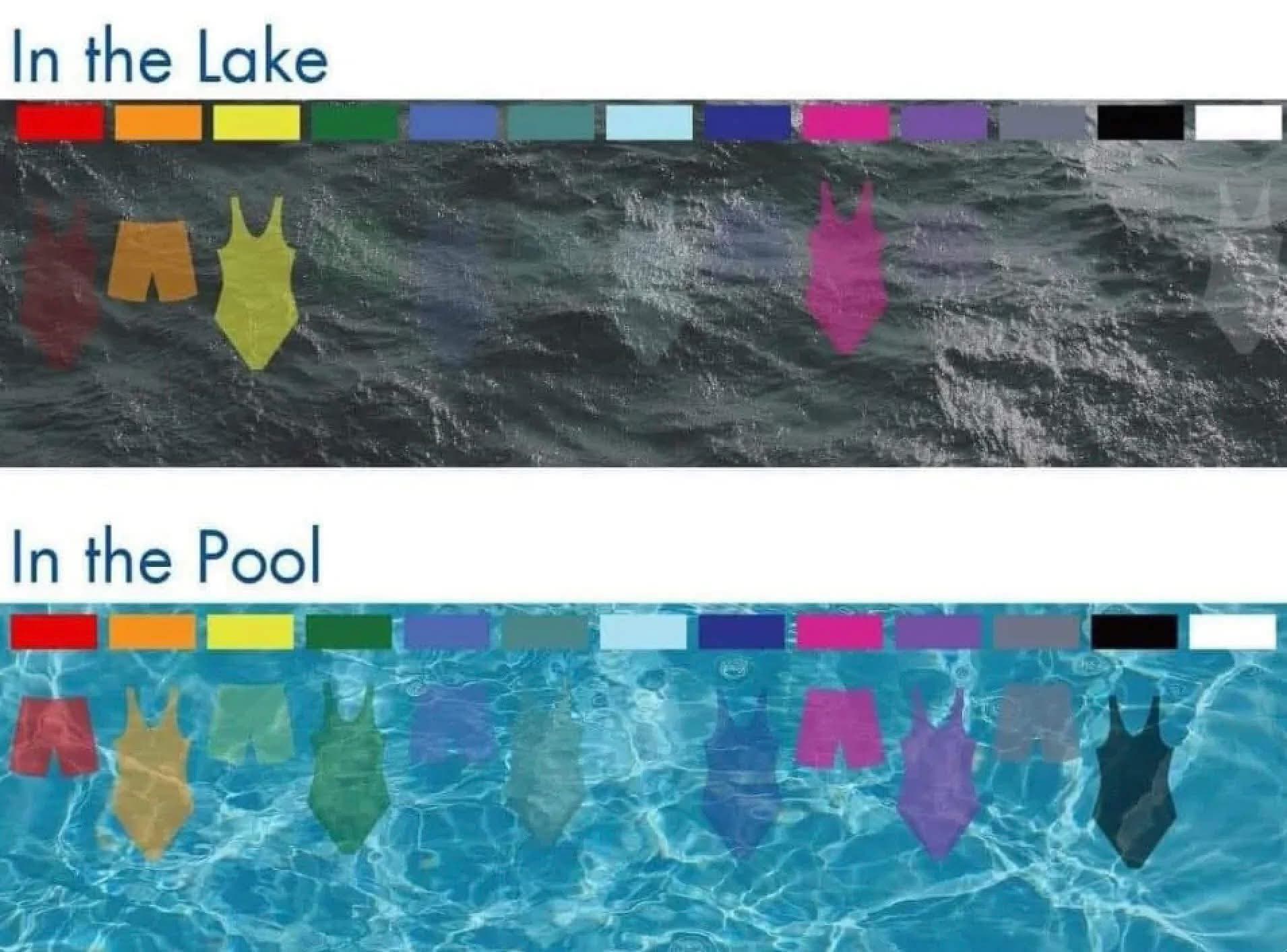 It’s important to wear color bathing suits when swimming in murky water such as a lake and colors for a pool. Please see chart for best colors in murky water and best in pool water. This important for safety. When you come to Allatoona Aquatics Base for MB Saturdays please wear a color bathing suit that is visible in the water based on this chart.