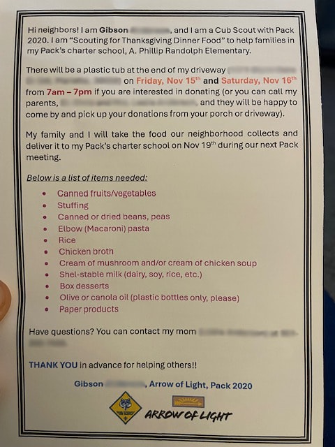 Over the last several weeks, the Scouts and families of Pack 2020 came together with a mission of service: to collect food for families in need at their Chartered Organization, A. Philip Randolph Elementary School. Through dedication, teamwork, and a shared sense of purpose, they made a meaningful impact while embodying the true spirit of Scouting.